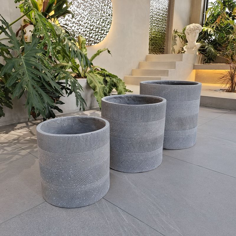 The Fiber Clay Planters come in two sizes: Size A measuring A:D450*H450 B:D390*H390 C:D330*H330 providing options for different plant arrangements and space requirements. The textured surface of the planters adds a touch of elegance and sophistication to any setting.
